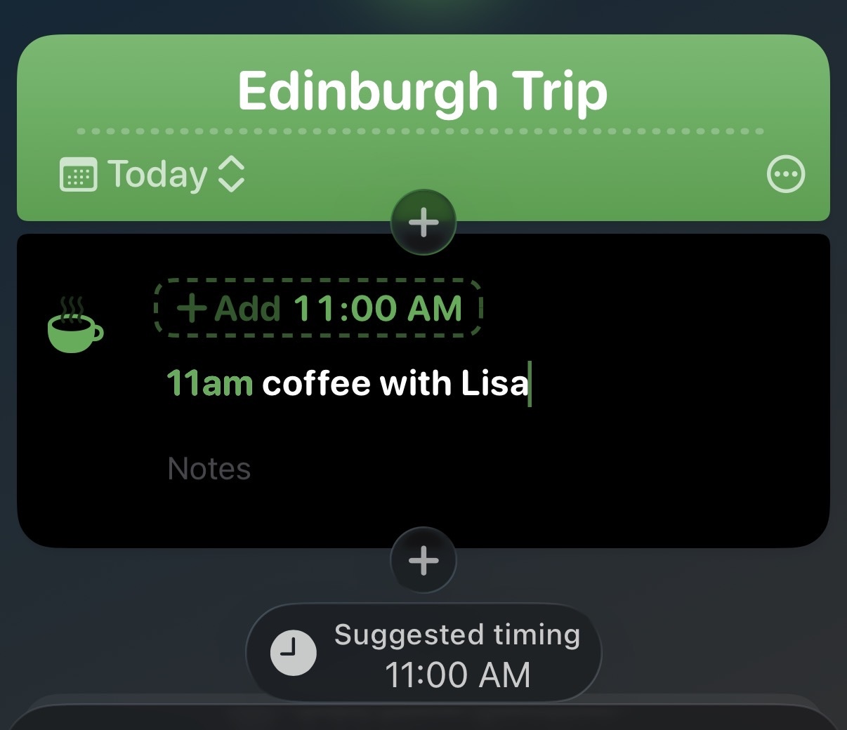Hour by Hour is designed to let you quickly jot down an agenda for your day without fussing with pickers or menus. The fastest way to capture your schedule is simply to write the timing of an event in plain English: