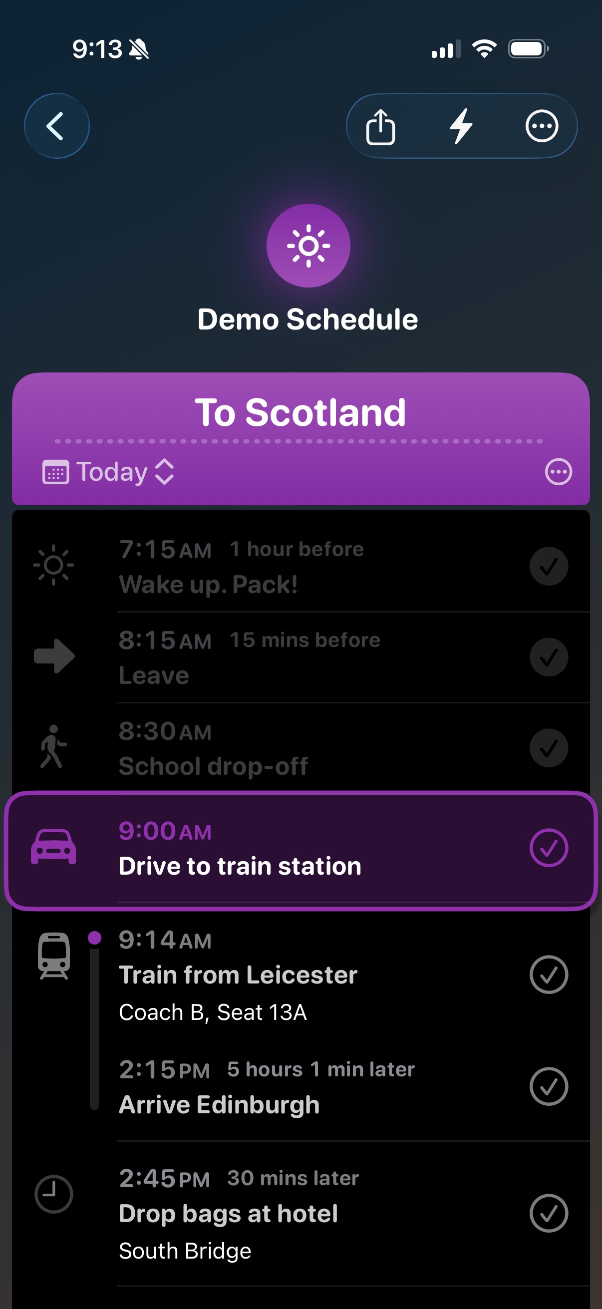- Time blocks: From a simple start-to-end range to a multi-step sequence: see your progress through each block and show it on the lock screen as a Live Activity. Especially useful for complex travel plans with multiple stops and changes.