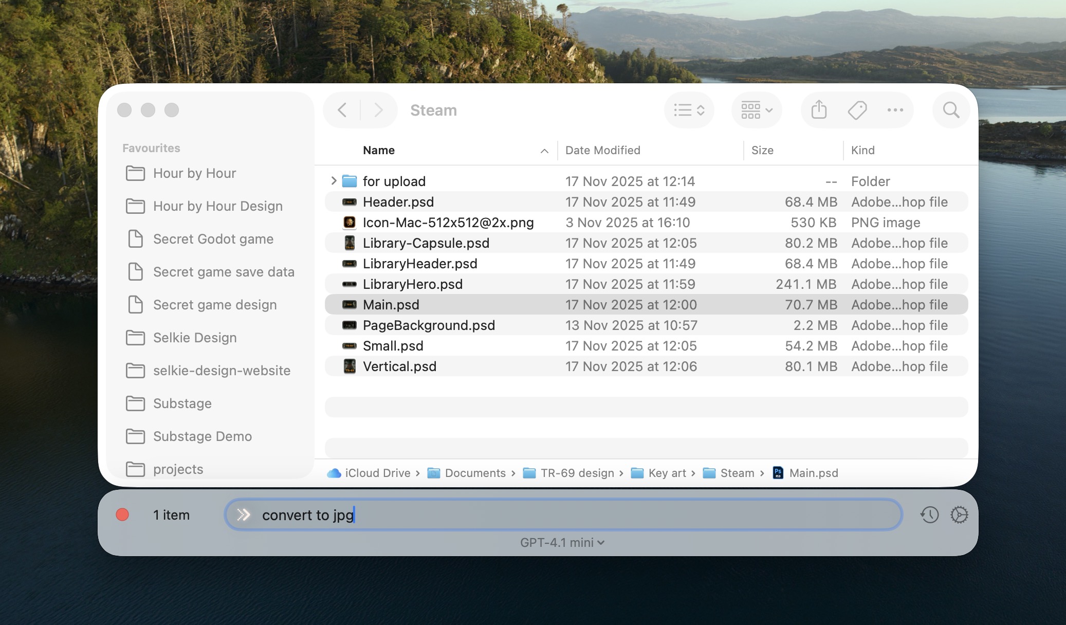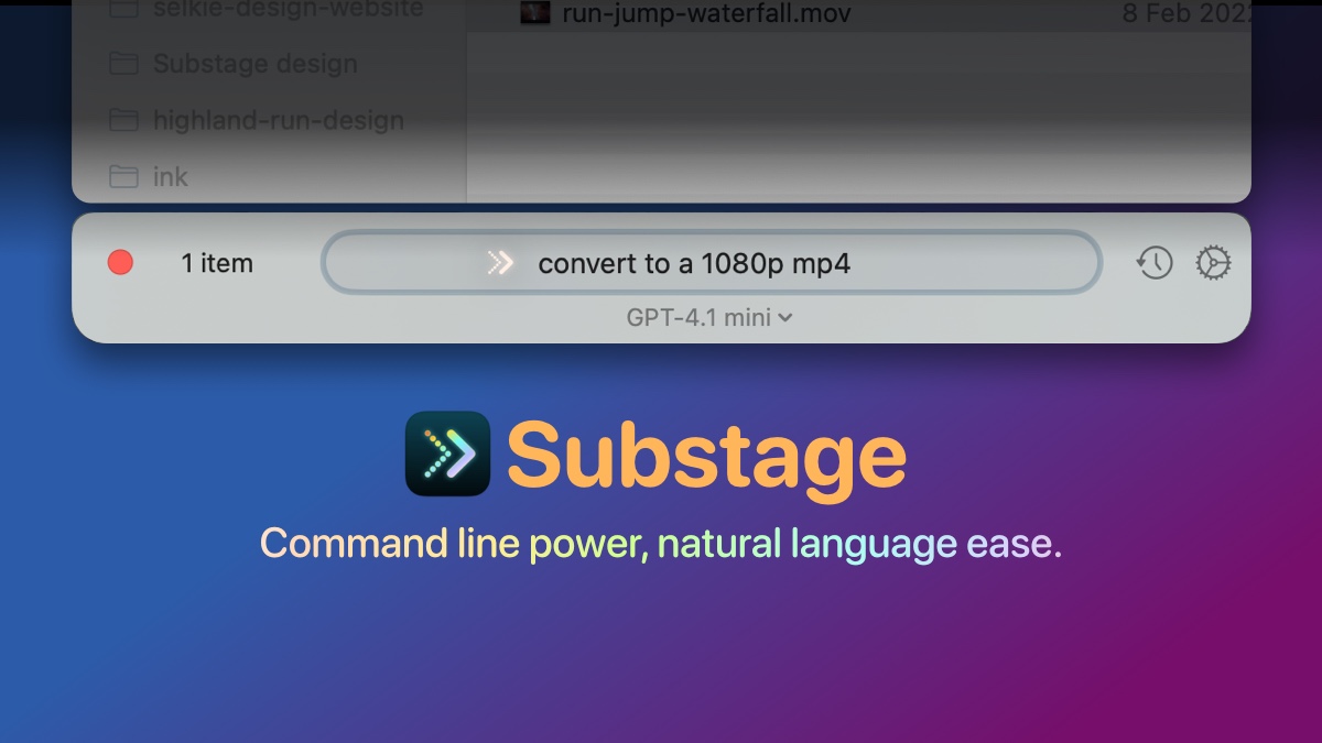 Substage is a Mac app that puts a command bar below your Finder window. You can act on your files using natural language: convert media, run calculations, manage files, and more, without memorising terminal commands. It combines the power of the command line with the ease of plain English (or your preferred language).